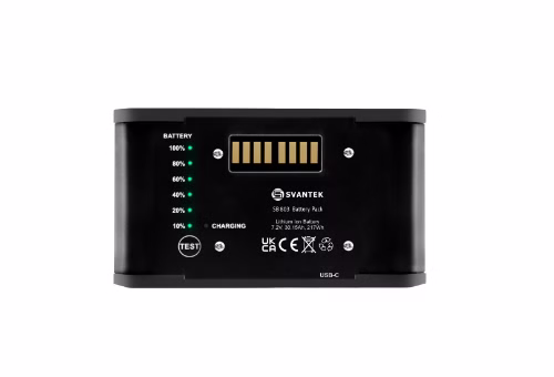 The SB 803 is a high-performance lithium-ion battery pack designed specifically for use with the Svantek SV 803 Wireless Vibration Monitor. With a nominal capacity of 217 Wh and an output voltage of 7.2 V, the battery pack is equipped with an intelligent charging module that is compatible with USB Type-C and USB Power Delivery power supplies. The user-friendly LED status bar displays the current charging status, ensuring easy and convenient use. With a wide operating temperature range and the ability to be charged from any power supply with a USB-C cable, the SB 803 is designed for reliability in all climates. The battery pack has dimensions of 120 x 108 x 75 mm and weighs 1.3 kg. It is capable of operating in temperatures ranging from -20°C to +60°C.