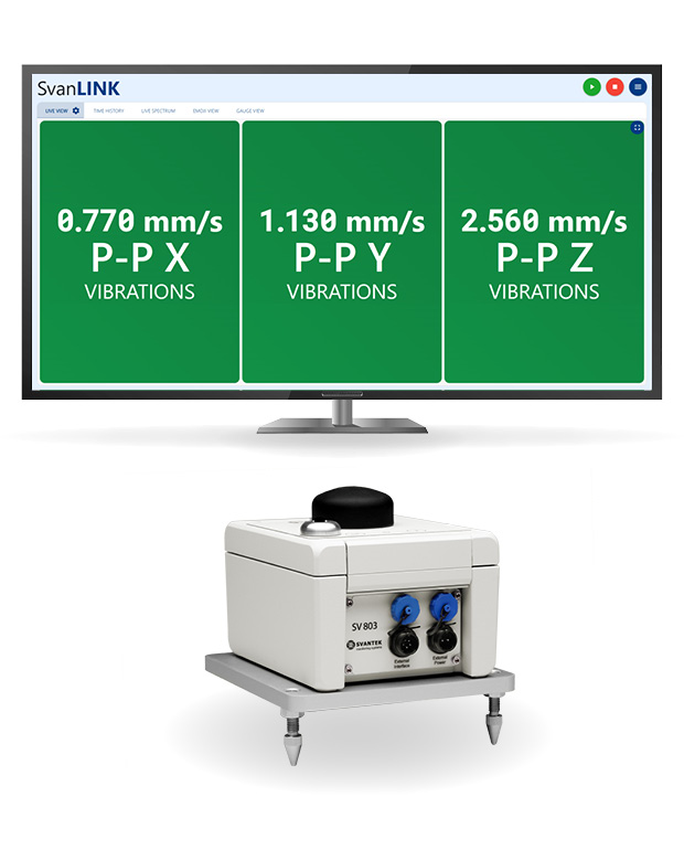 Users can visualize and analyze PPV and frequency vibration data in real time alongside acoustic results within a single SvanLINK interface. This functionality supports simultaneous assessment of both noise and vibration metrics across building, ground, and environmental applications. SvanLINK enables comprehensive environmental and structural monitoring using SVANTEK's integrated measurement systems.