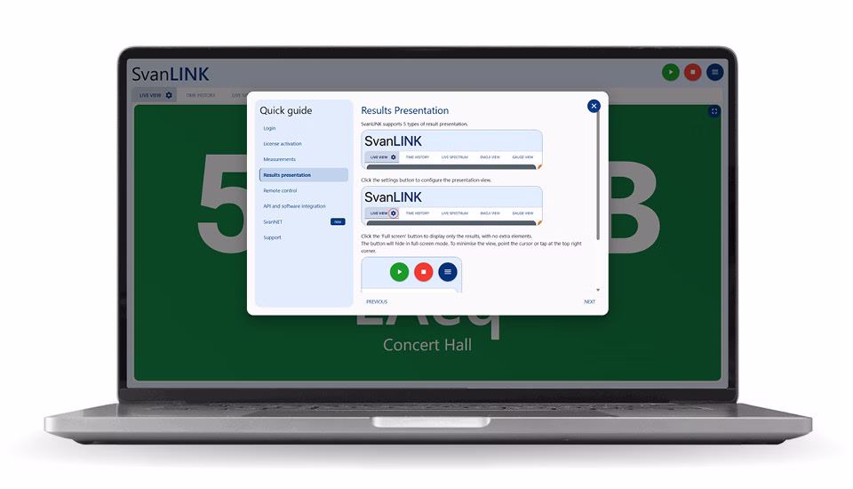 SvanLINK is a cross-platform application that provides real-time visibility into noise measurements from SVANTEK instruments, integrating them for live noise monitoring and control. The software allows data to be displayed on public screens such as TVs, LED walls or industrial monitors, as well as on internal company systems. It runs on Windows, Linux and macOS and can also be supplied pre-installed on dedicated controllers — the SD 312 for indoor use and the SD 310 for outdoor installations. Thanks to its open API and multiple display modes, SvanLINK offers complete flexibility: from monitoring local measurements on-site, to transmitting results into IT systems, to enabling remote access via SvanNET. This makes it an ideal solution for both public communication of environmental noise and internal occupational noise control.